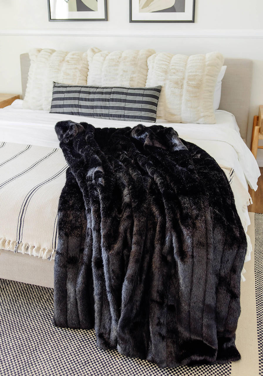 Wrap yourself in luxury with the Black Mink Faux Fur Throw, a sumptuous blend of softness and style. Crafted from premium modacrylic and acrylic pile with a plush polyester backing, this throw delivers cozy comfort without the guilt. The velvet-lined interior adds an extra layer of indulgence, while the durable construction means it'll stay fabulous for years.