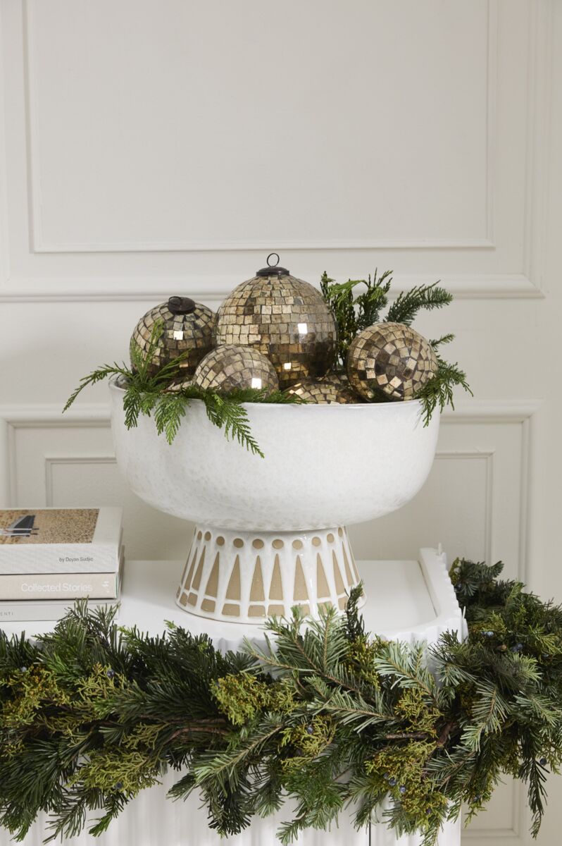 Add a warm glow to a holiday display or Christmas tree with the Antiqued Disco Ball Ornament Collection. These tiled glass spheres have a mercury finish and a dark brass metal cap. Capture all the fun of the disco ball trend, but with a vintage vibe! On a tree or piled into a vessel as a decorative bowl filler, this collection will stand out as a seasonal favorite.