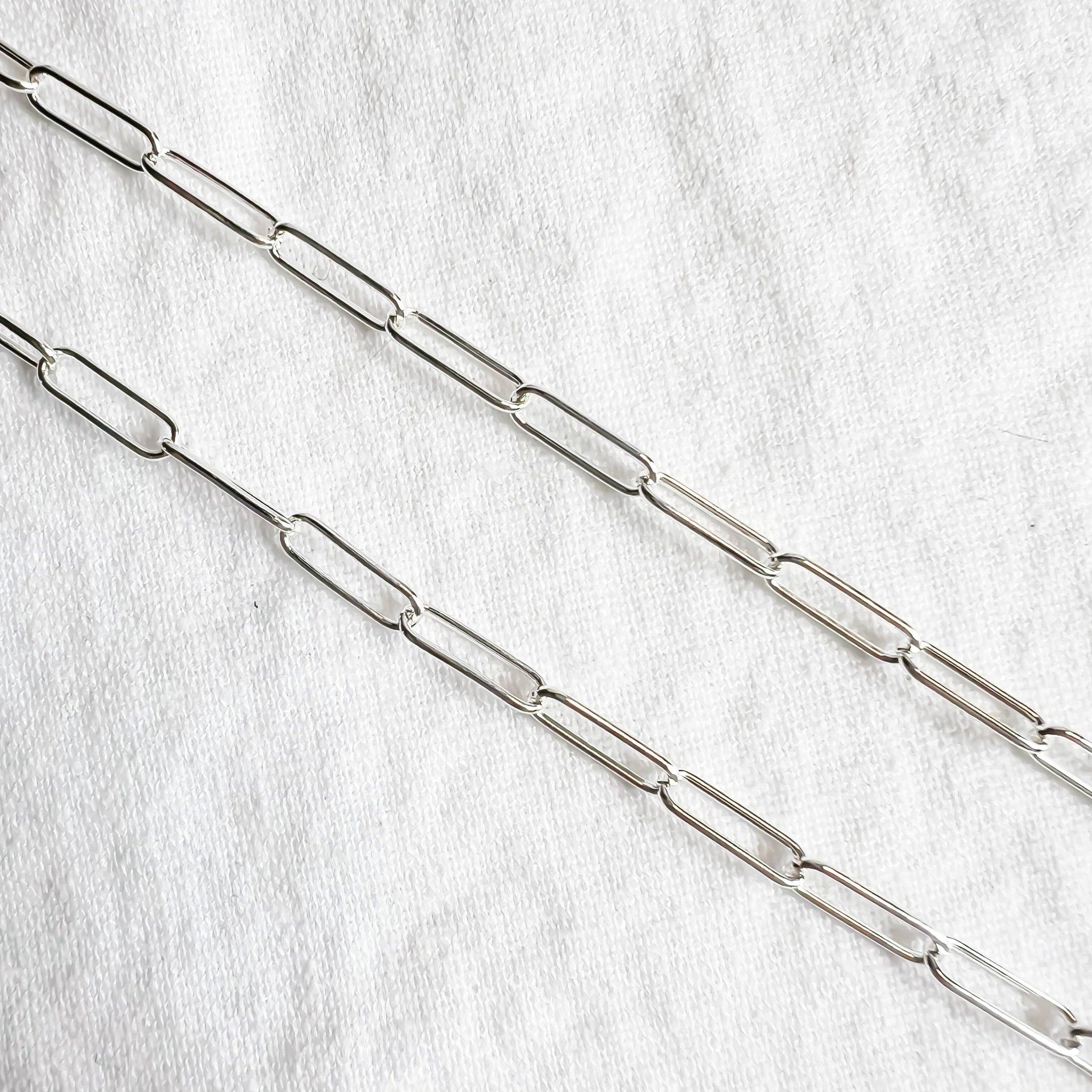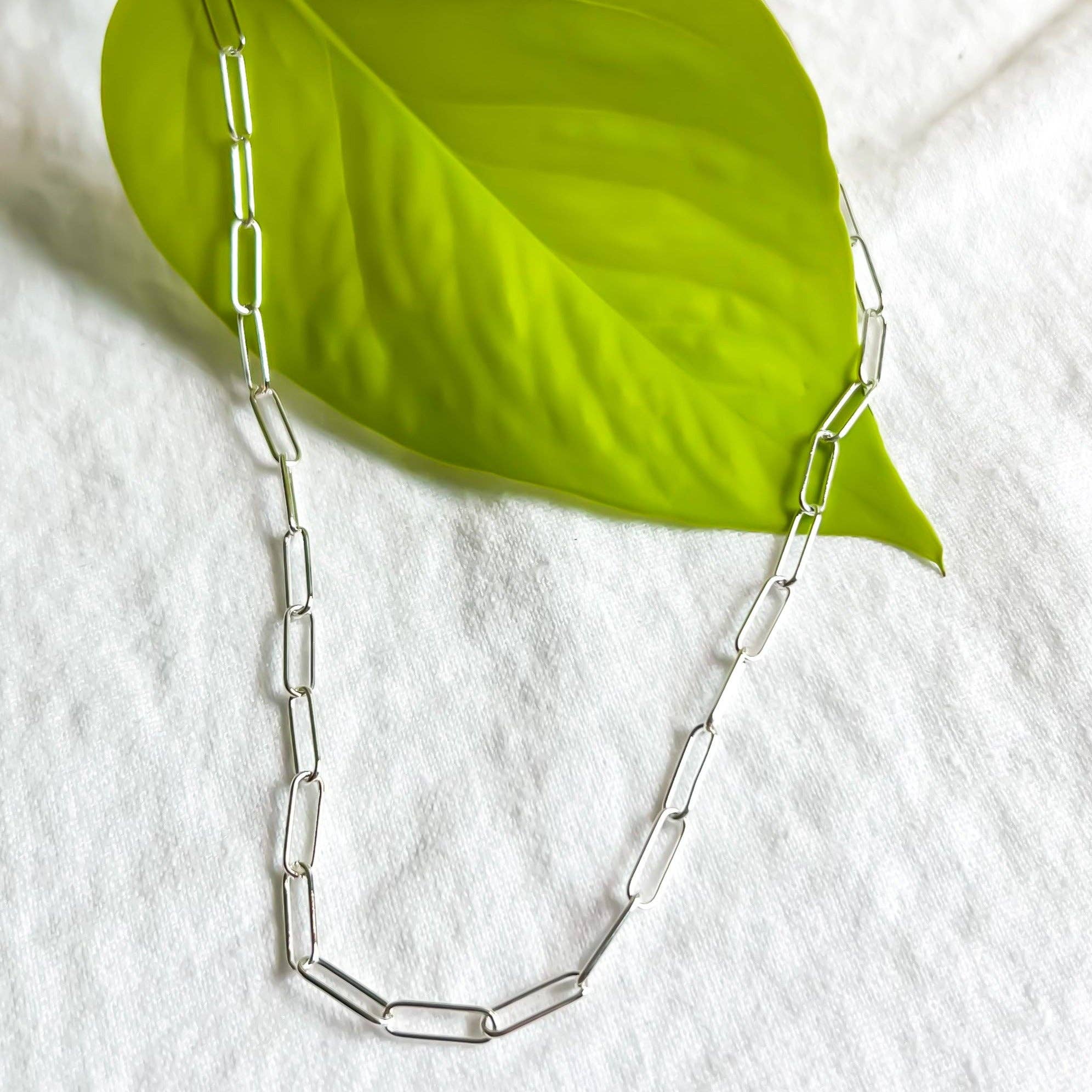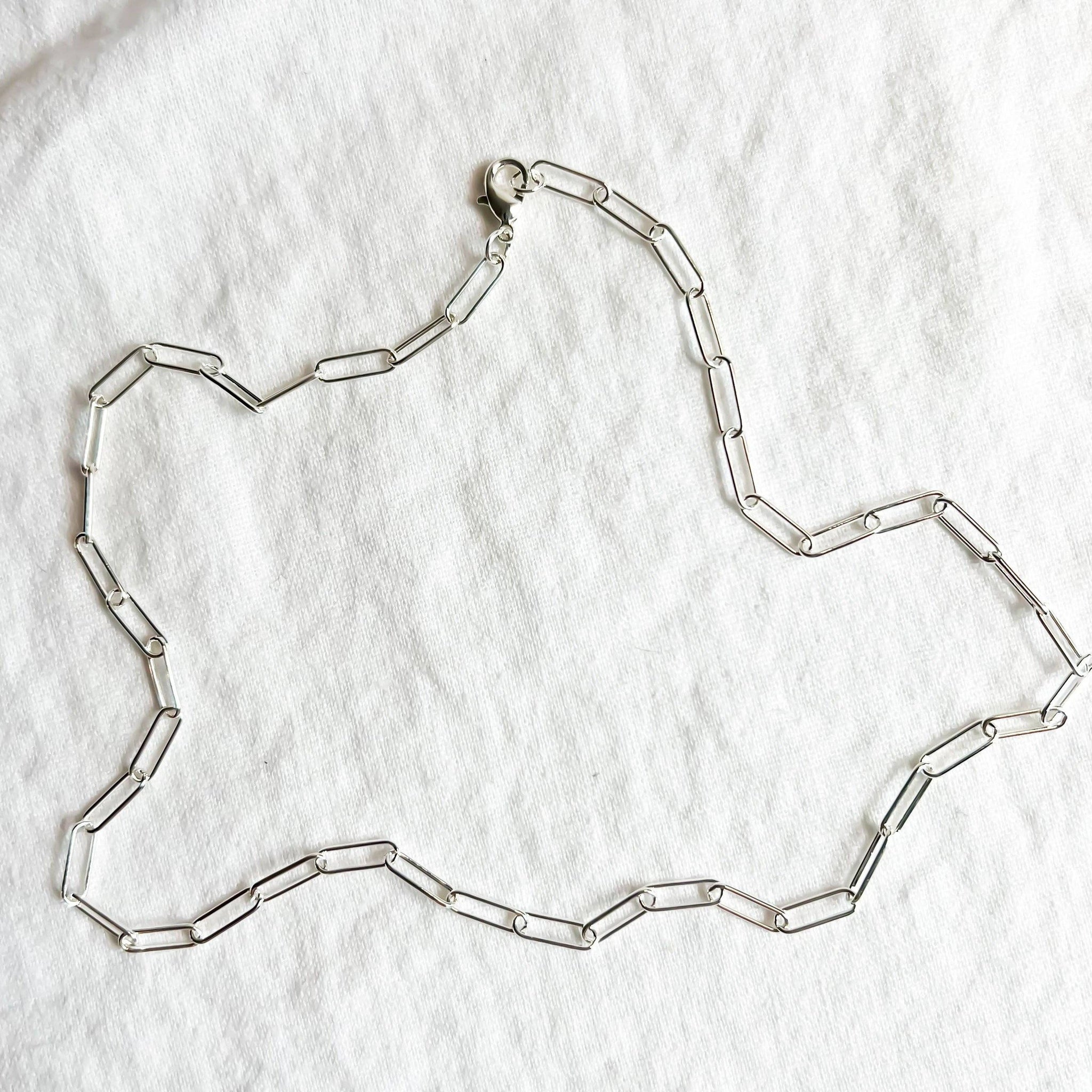 This silver chain paperclip chain is made from brass with lobster claw clasp. Measures at 18 inches but can clasp shorter for a choker style.