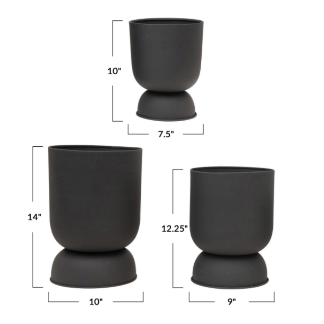 These handsome textured metal footed planters are a great addition to your decor. They have a bold and stylish shape that makes this set a unique and attractive accent for any living room, kitchen, office, or sunroom.