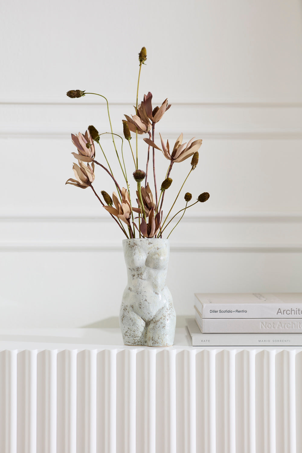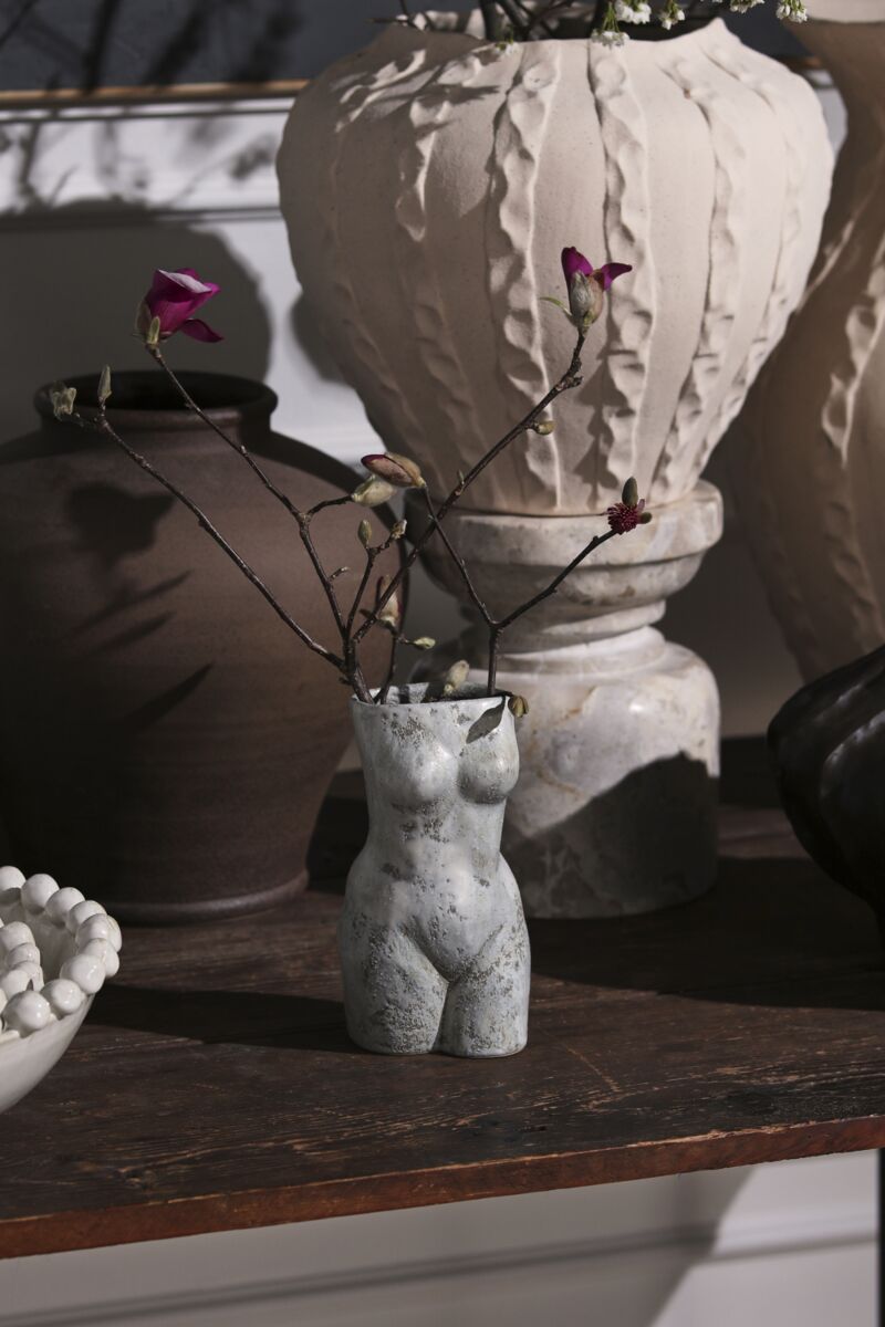 Celebrate art & the female form with the timeless yet modern elegance of the Anora Vase. This sculptural piece is functional as a vase for blooms & stunning as a decorative object on styled shelves. Featuring a rusty, washy white finish with natural clay that peeks through, this vase brings an aged artfulness to home decor.