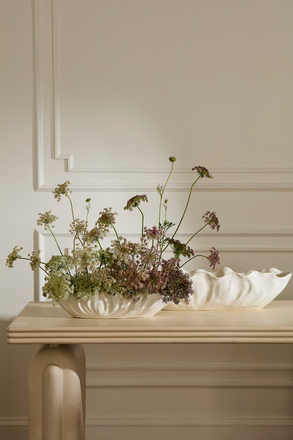 Celebrate artisanal style with the elongated wide ceramic Coastline Trough. Featuring an organic ruffled rim & a warm white reactive glaze that provides variation in the finish, this piece makes a lovely long centerpiece for floral arrangments, orchids, other blooming plants. The dimensions allow for any type of floral mechanics. This home decorative accent piece is a lovely display for a console, coffee table, or dining table.