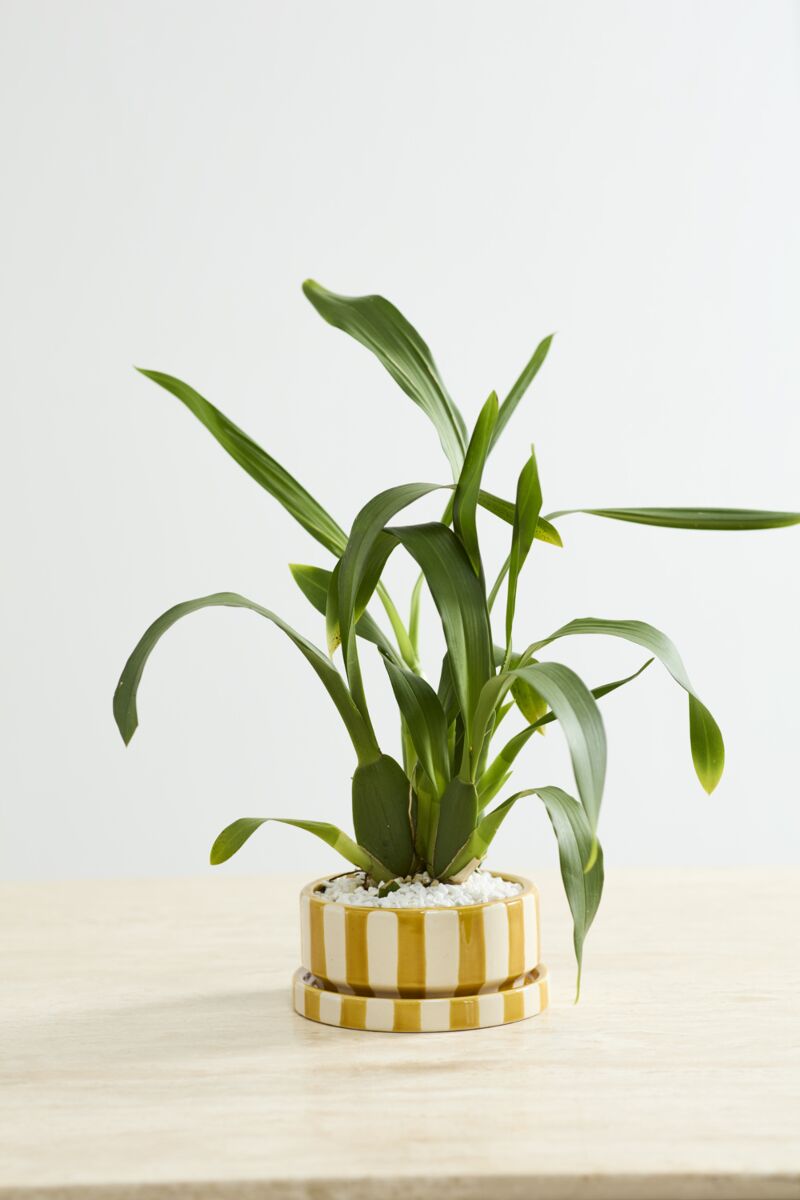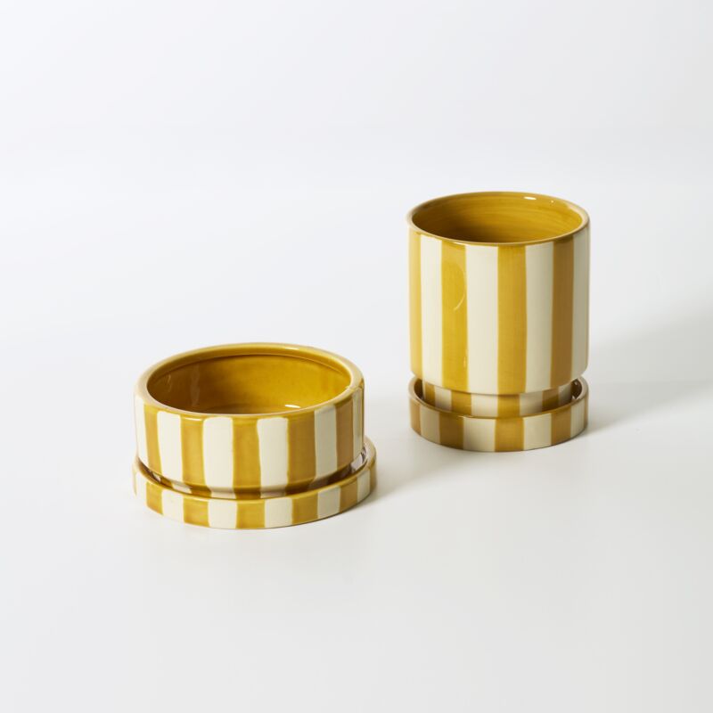 Playful hand painted stripes in marigold and white wrap around the Saffron Pot with Saucer, a low footed pot with drainage, perfect for planting succulents. The glossy finish and simple shape feel fresh and bright and bring a touch of pattern to any plant collection.