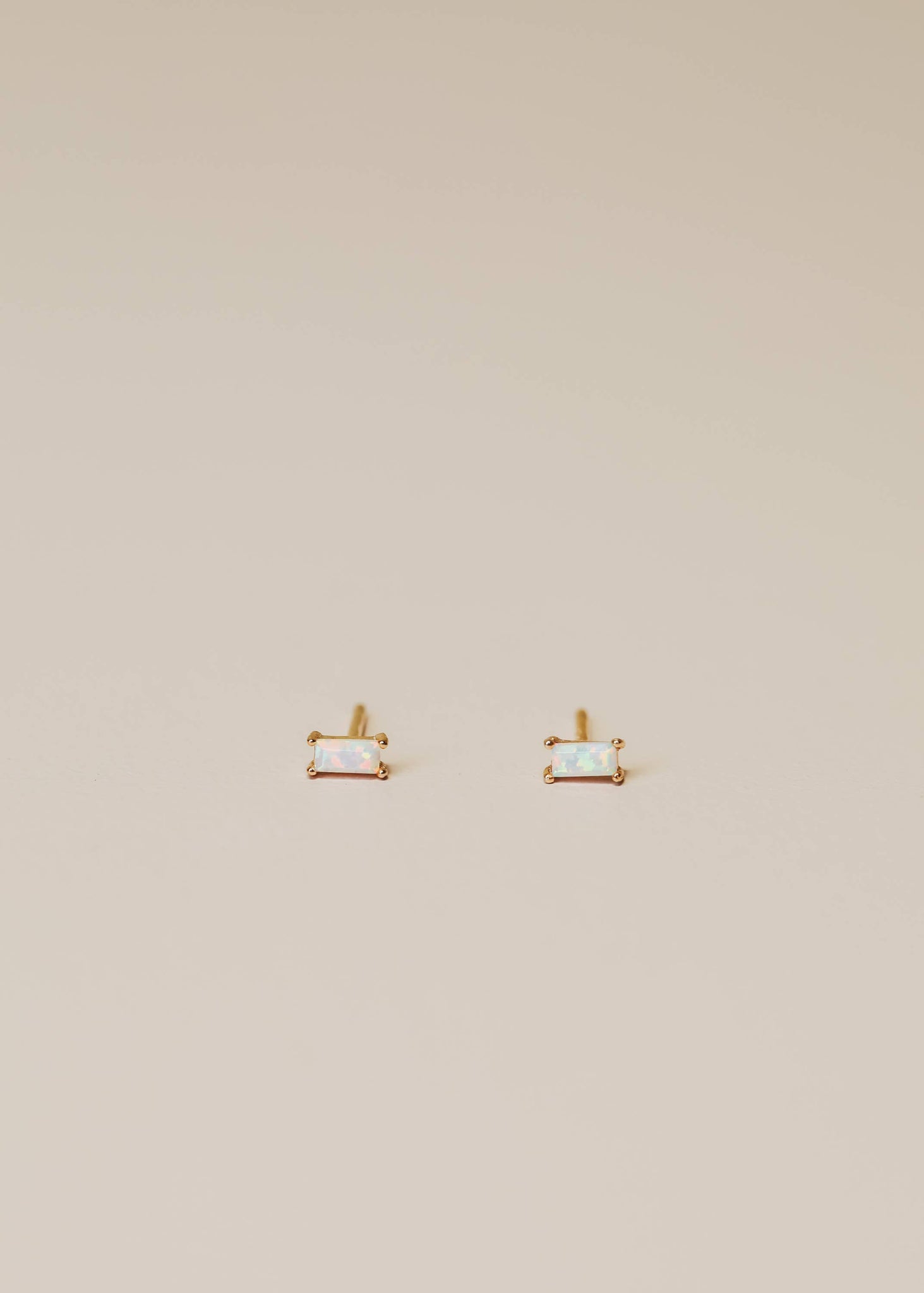 A customer favorite, our opal baguette is made for stacking! Featuring a petite polished synthetic Opal stone cut into shape and set in an 18k gold-plated prong earring over sterling silver.