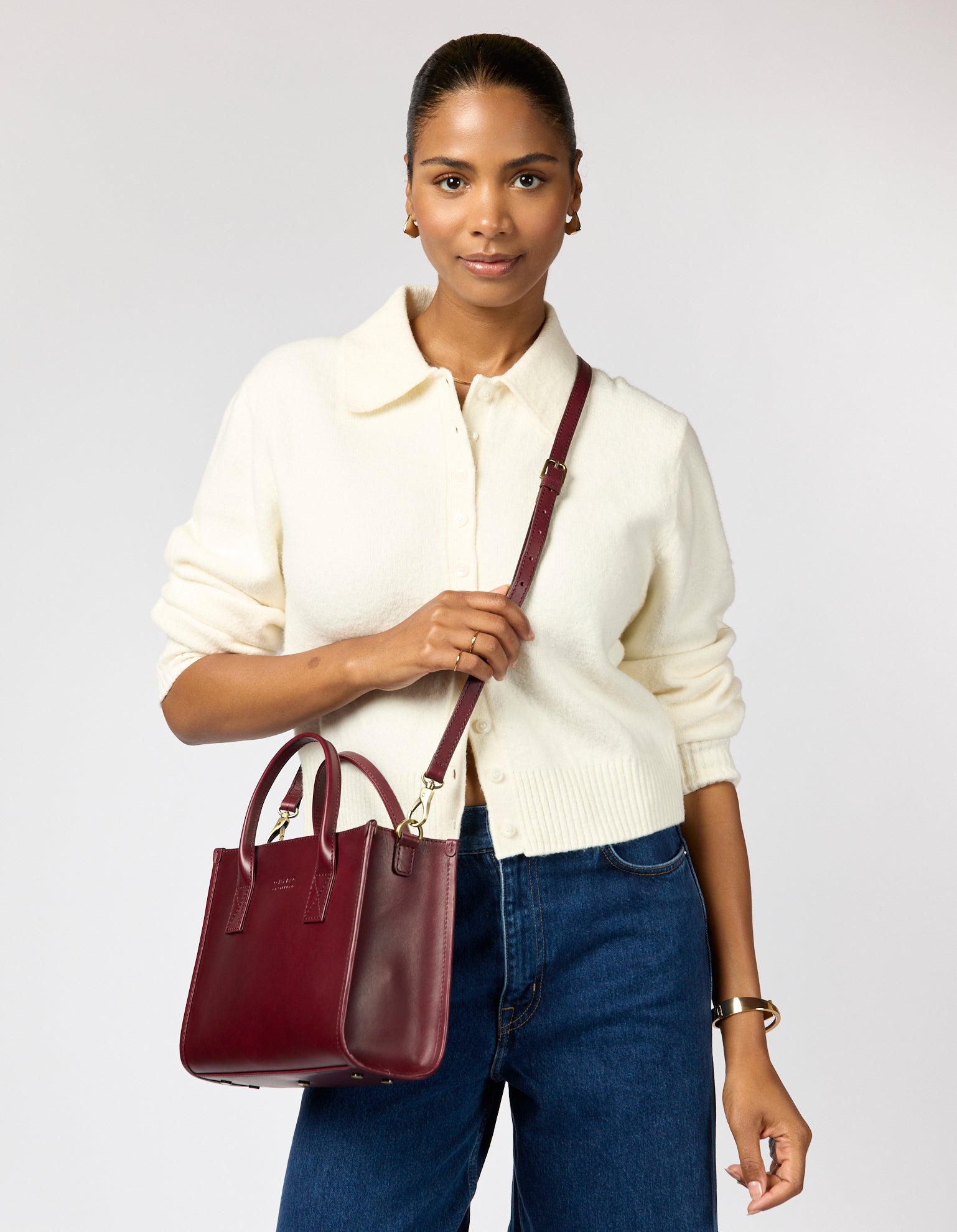 Say hello to Jackie Midi in Dark Cherry Classic Leather, a bold yet timeless new addition to our Jackie family. Fixed top handles and an adjustable leather strap let you wear her crossbody or carry it by hand.