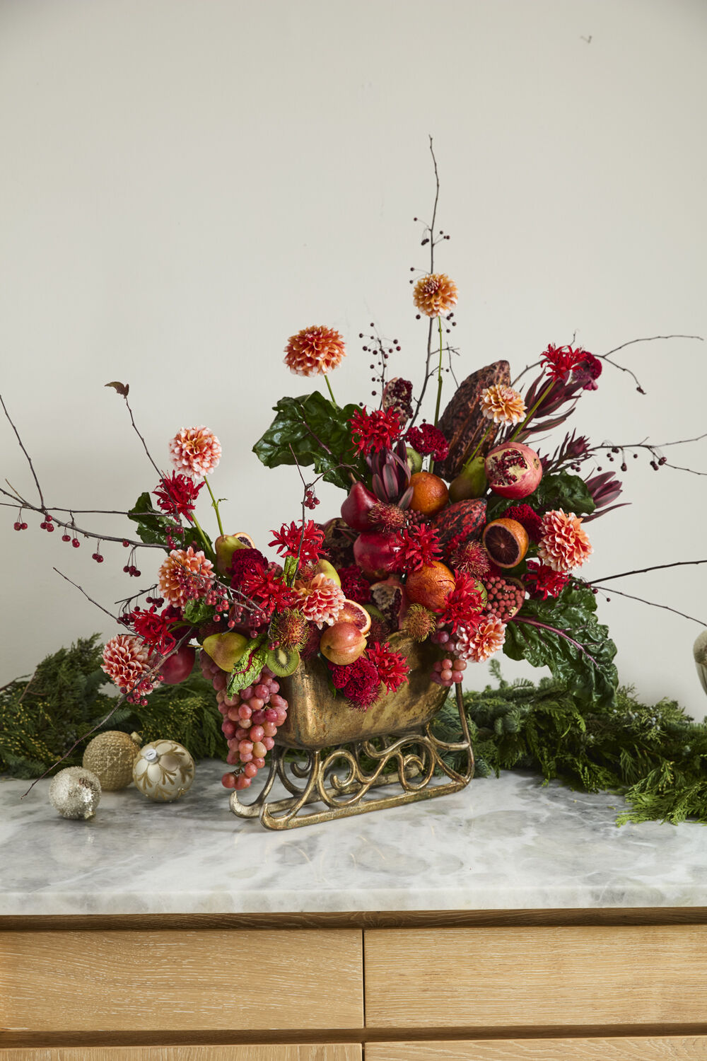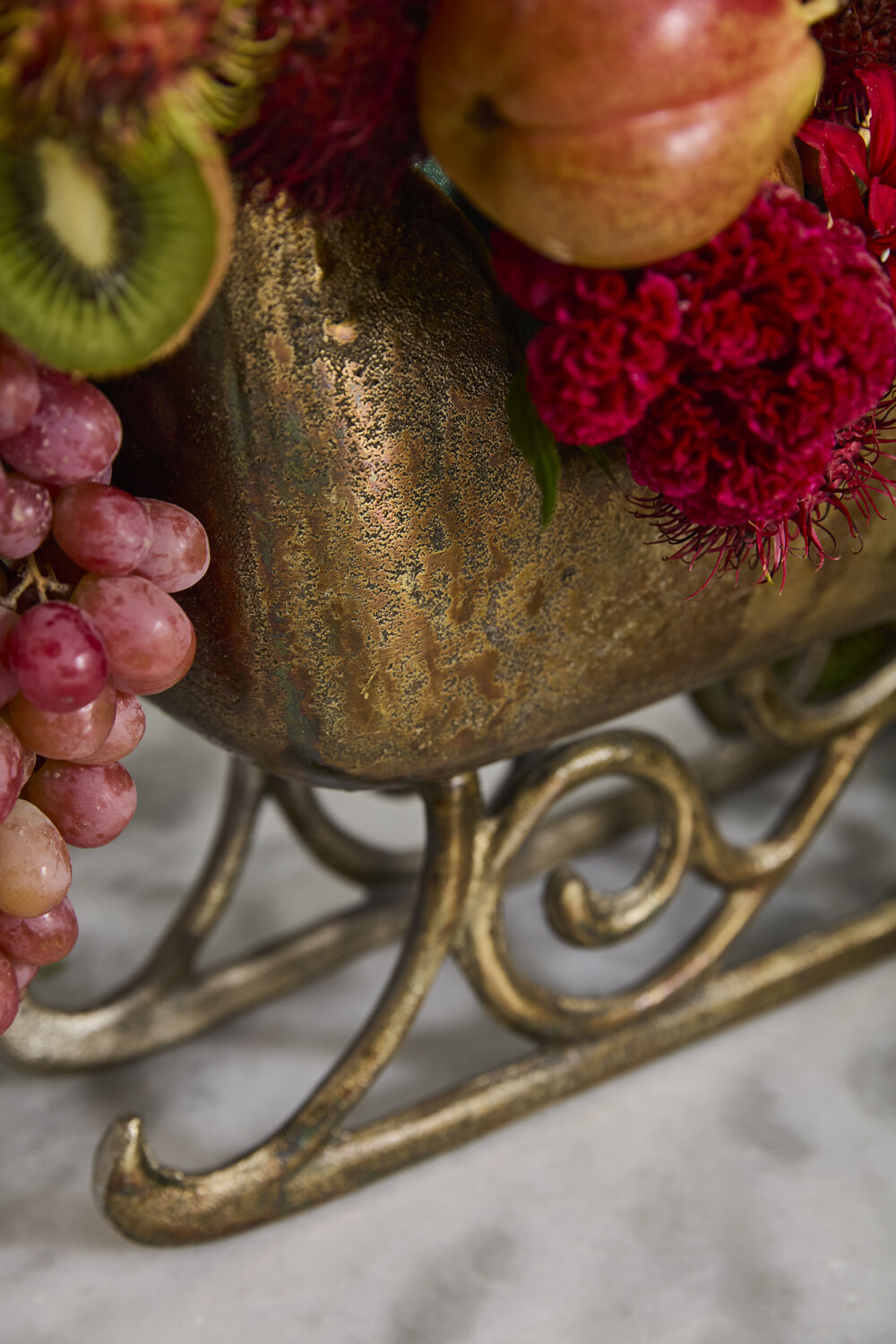 Oh what fun it is to display holiday plants and decor in the Vintage Sleigh Planter, a beautiful, traditional winter sleigh with an antique gold finish. With an elevated base that has scrolling details, and roomy interior, this cast aluminum sleigh can easily be filled with shiny ornaments, a small seasonal tree, or a large scale fresh floral arrangement. The Vintage Sleigh Planter is a perfect centerpiece for a holiday dinner table.